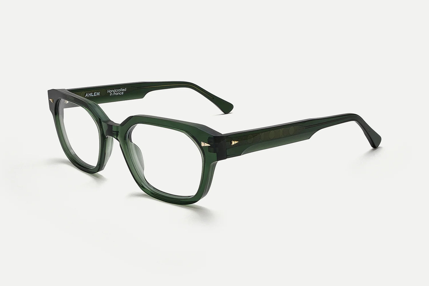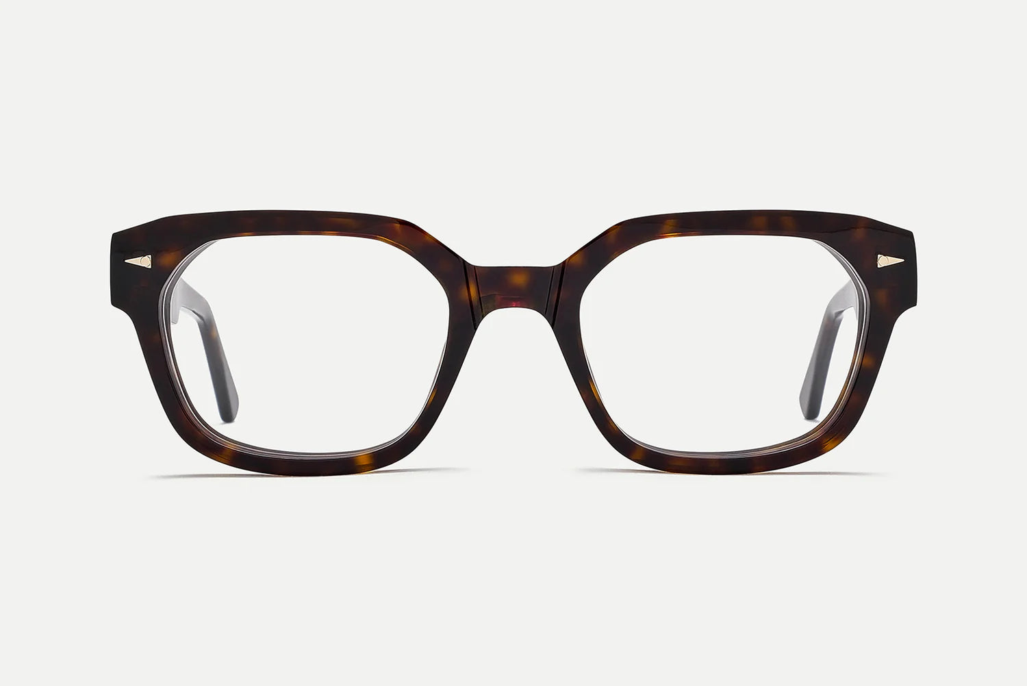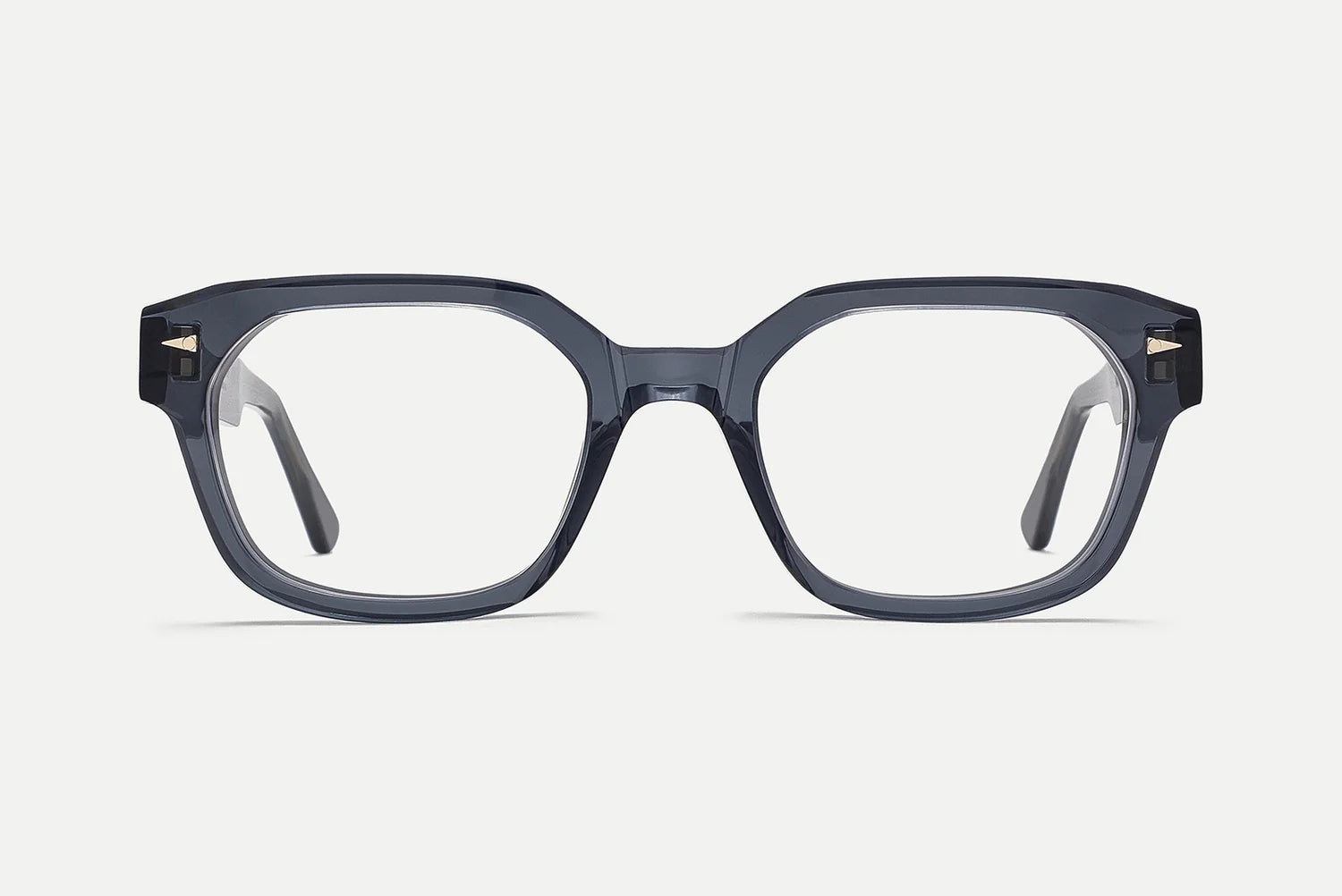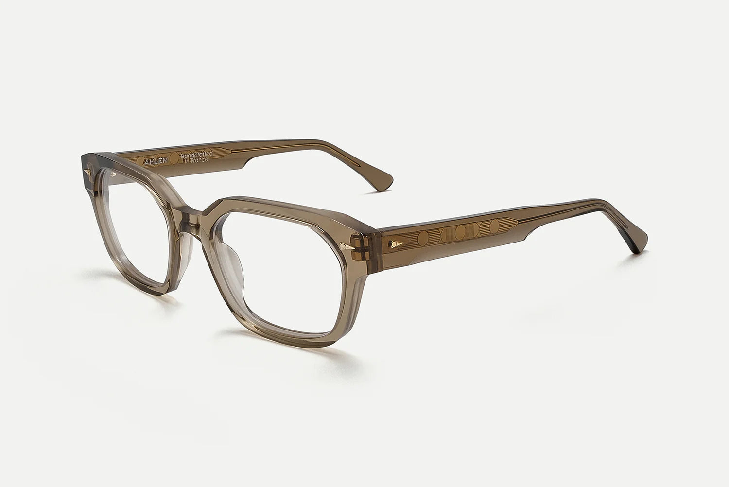 Electroplated 22k gold hinges, custom design temple core, beveled temples, and signature geometric accents.