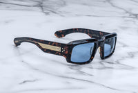 MATERIAL: 8MM POLISHED ACETATE FRAME CUSTOM DOUBLE LAMINATED ACETATE TEMPLES FT. PRECIOUS METAL HARDWARE