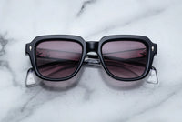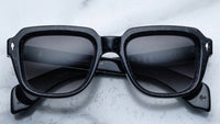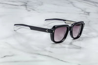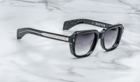 MATERIAL: 10MM BLOCK ACETATE FRAME, CUSTOM DOUBLE LAMINATED ACETATE TEMPLES FT. PRECIOUS METAL HARDWARE.