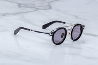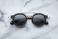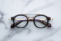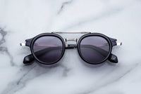 Circular '50s-inspired combo spectacles with heavy acetate lens shape, distinct titanium brow bar, our signature arrowhead monoblock hinge, and finely engraved temples with unique arrowhead motif.