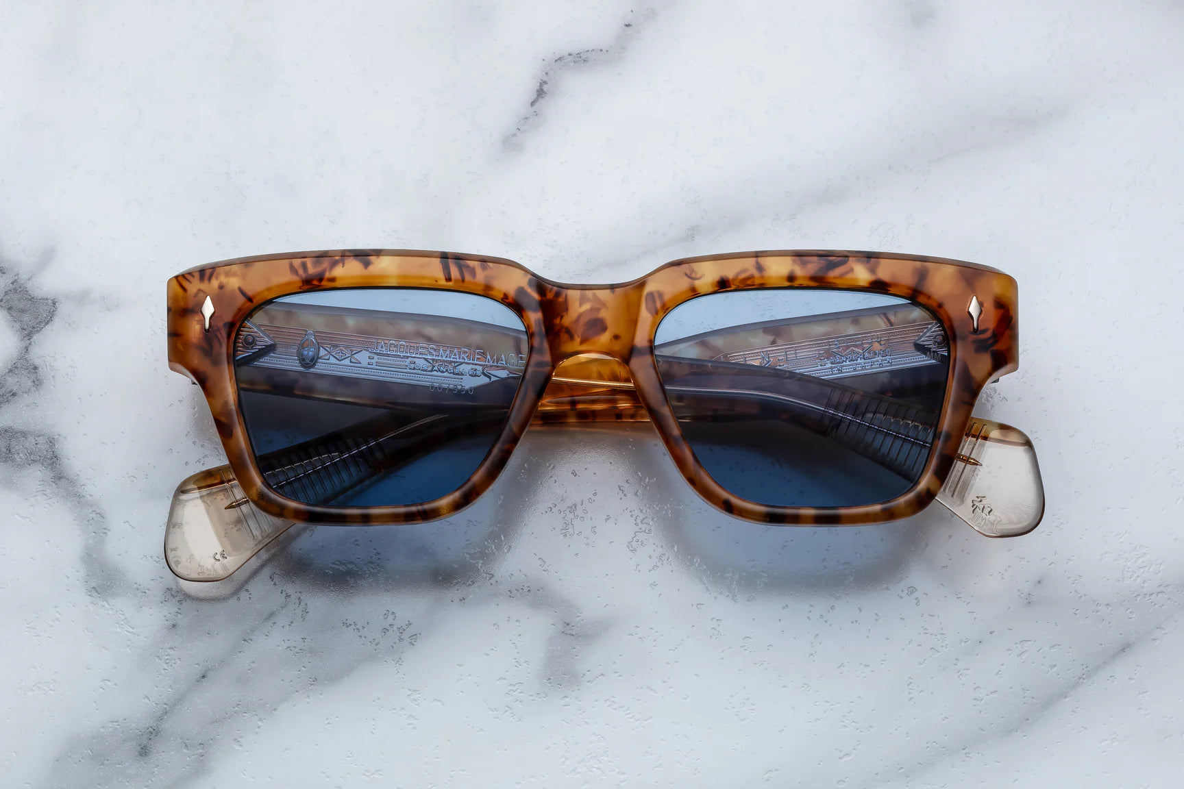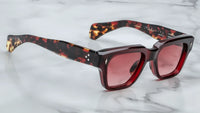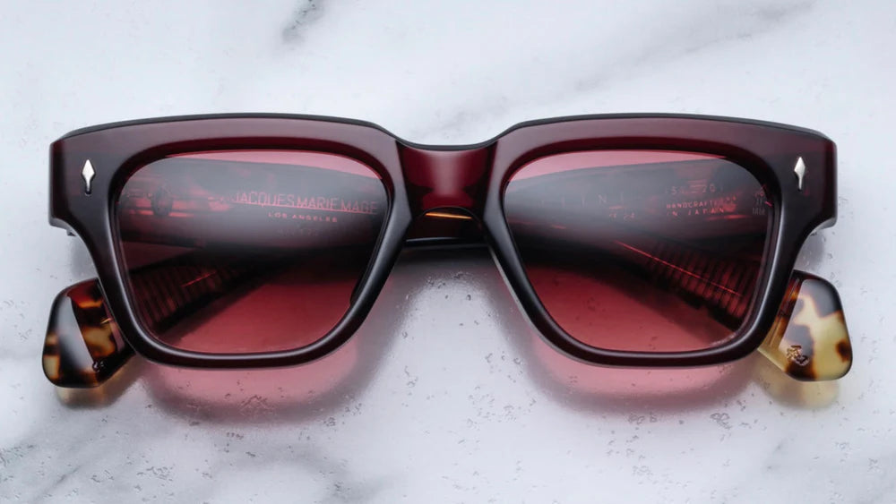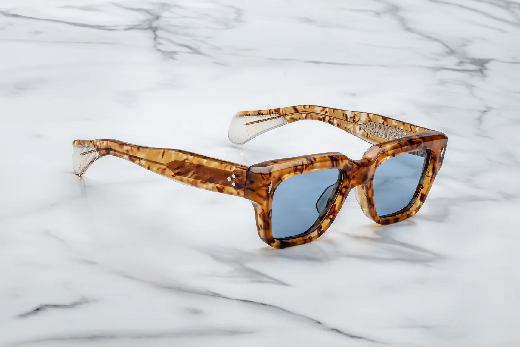 MATERIAL: 10MM POLISHED, CURED CELLULOSE ACETATE FRAME WITH CUSTOM DOUBLE LAMINATED ACETATE TEMPLES FT. PRECIOUS METAL HARDWARE