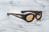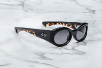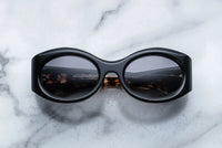 Edgy, elegant, oval spectacles with soft wrap-around effect and oversized temples with stunning sculptural details.