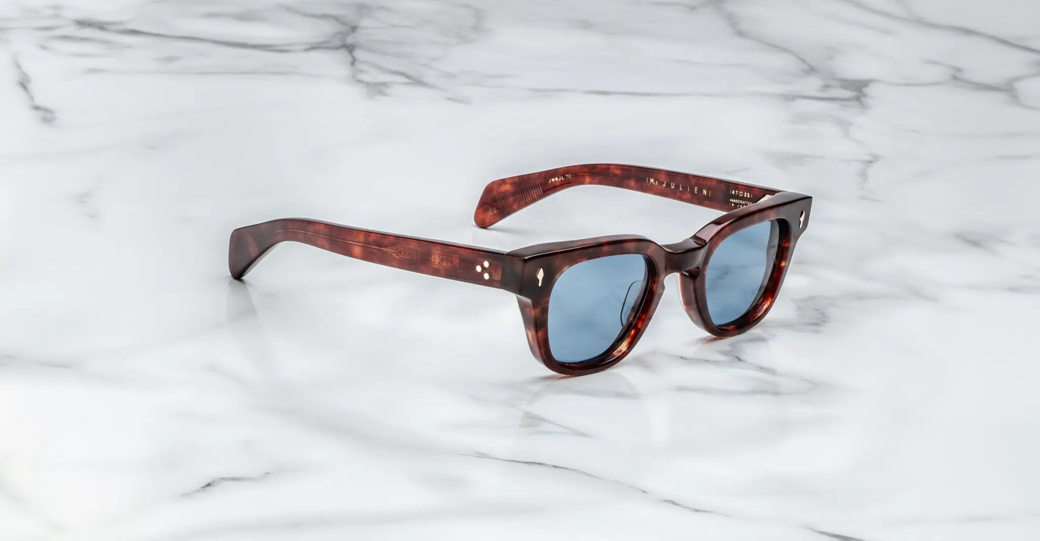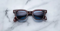 MATERIAL: 10MM POLISHED CURED CELLULOSE ACETATE FRAME CUSTOM DOUBLE LAMINATED ACETATE TEMPLES FT. PRECIOUS METAL HARDWARE
