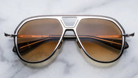 Classic, late-‘70s-inspired aviators in titanium with sculptural acetate temple tips, featuring a V-shaped profile, distinctive double-bridge and temples with dual-tone embellishments and hairline epoxy details.