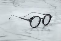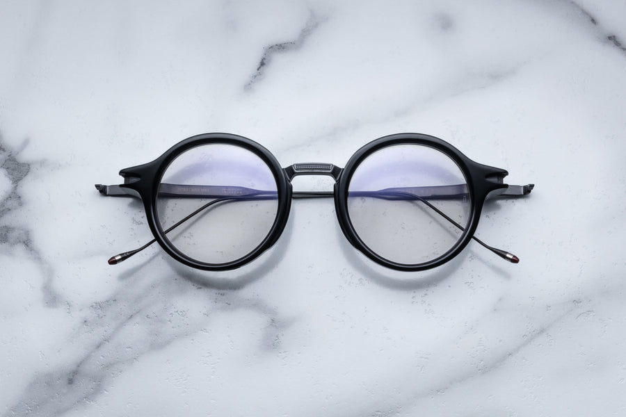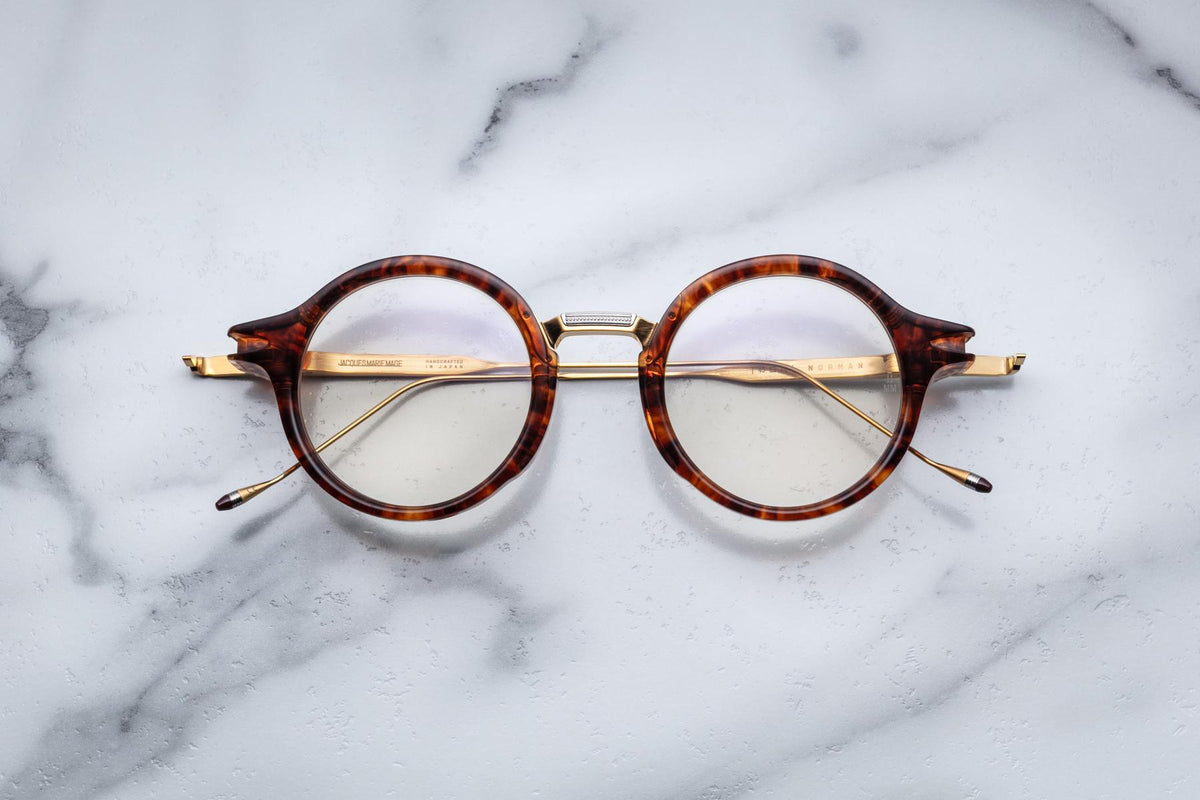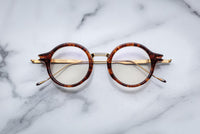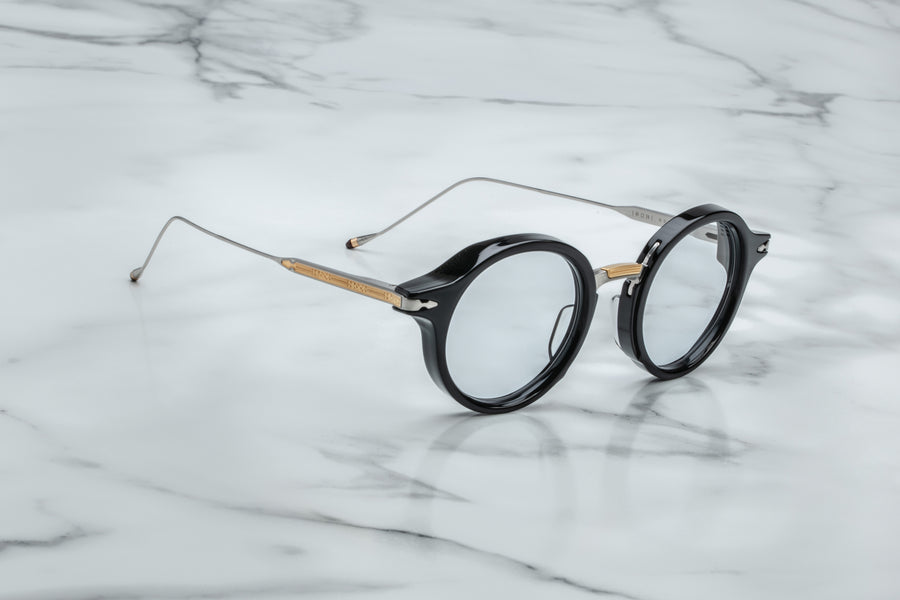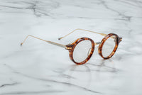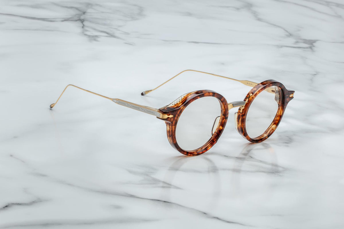 MATERIAL: CURED CELLULOSE ACETATE FRAME, CUSTOM DOUBLE LAMINATED ACETATE TEMPLES FT. PRECIOUS METAL HARDWARE