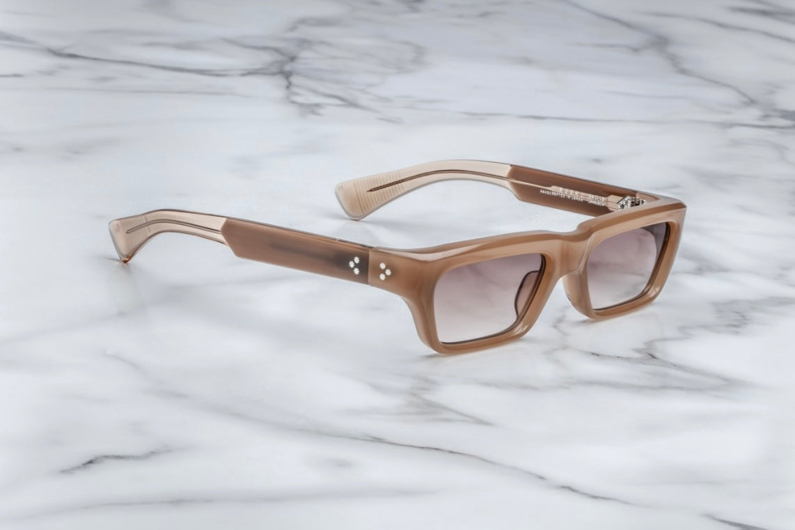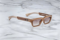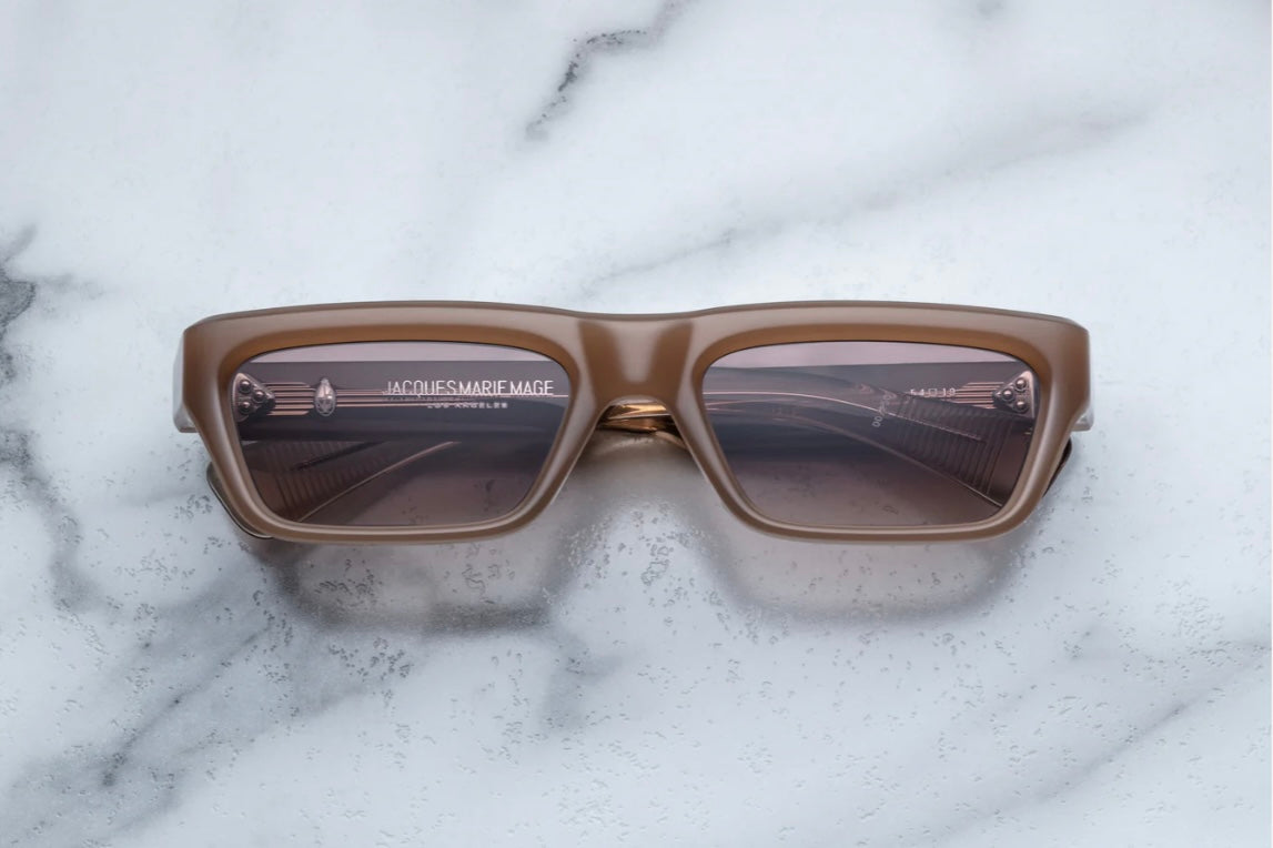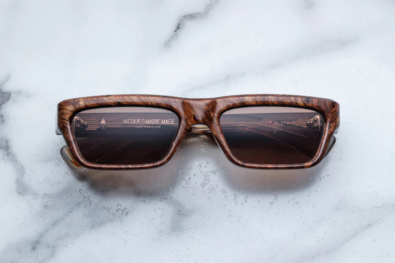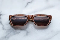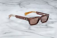 - BROWN 8MM CURED CELLULOSE ACETATE FRAME WITH CUSTOM DOUBLE LAMINATED ACETATE TEMPLES FEATURING PRECIOUS METAL HARDWARE AND BROWN GRADIENT LENSES