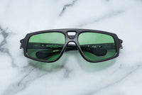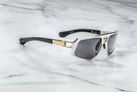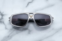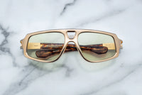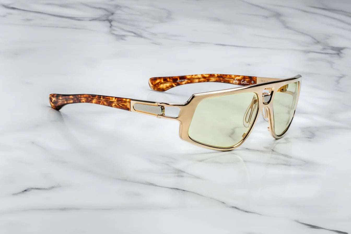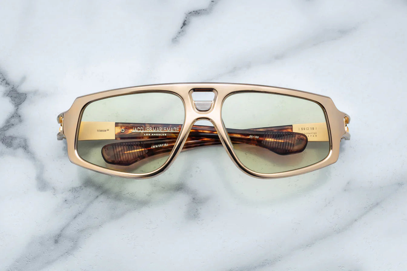 Expressive titanium wrap-arounds from GEORGE CORTINA FOR JACQUES MARIE MAGE, navigators feature distinctive double-bridge and temple cut-outs with dual-tone embellishments and energetic hairline details.