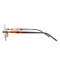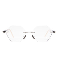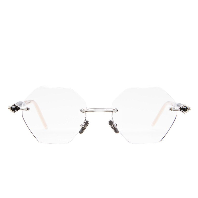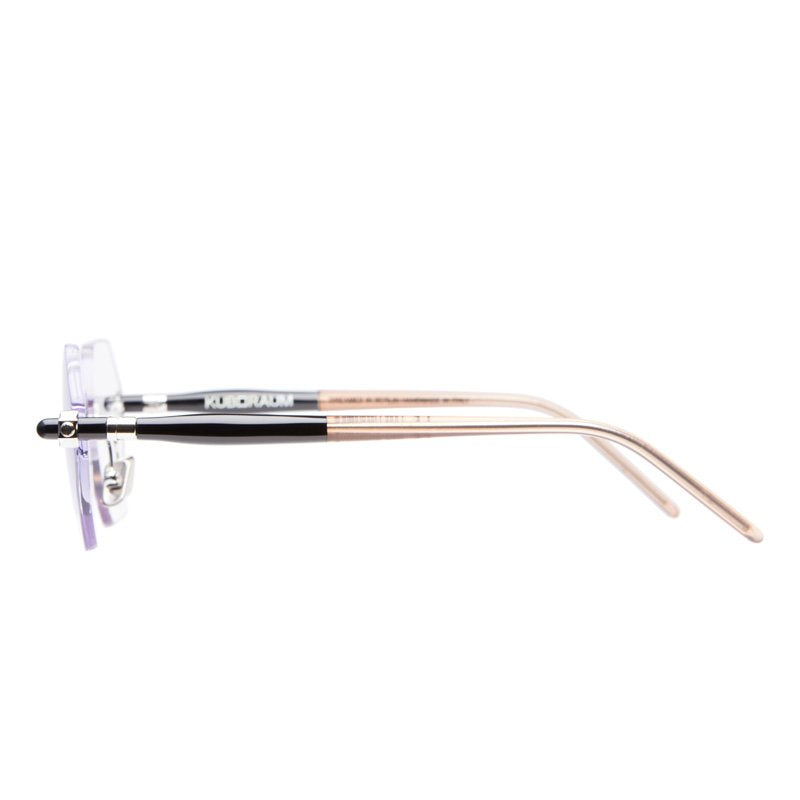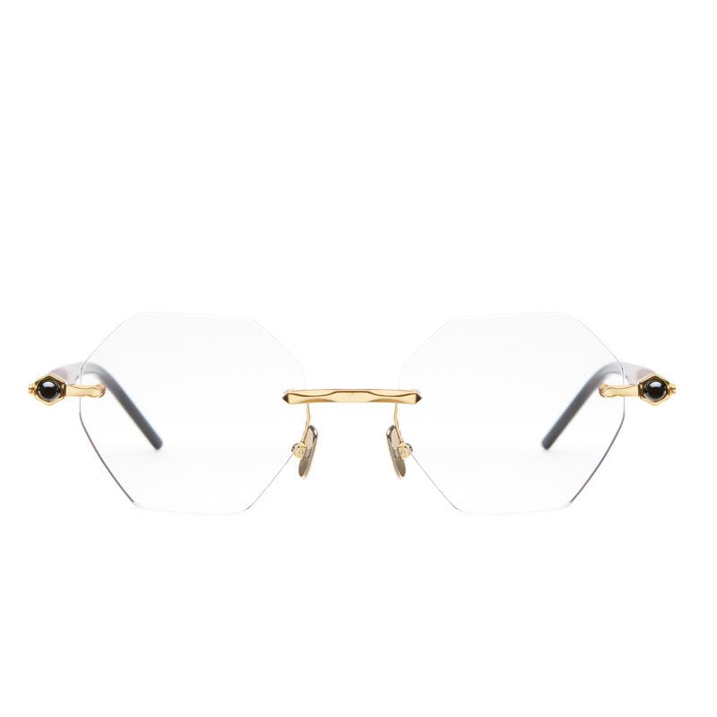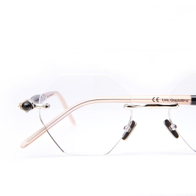 Geometric drill mounted lenses between sculptural, refined tubular temples. Discerning yet discrete.