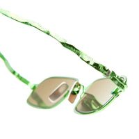Hammered metal finish lends itself to a rectangular shape, with edge. Fits a variety of face shapes and sizes.