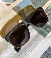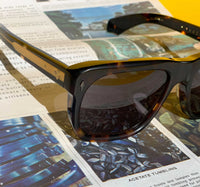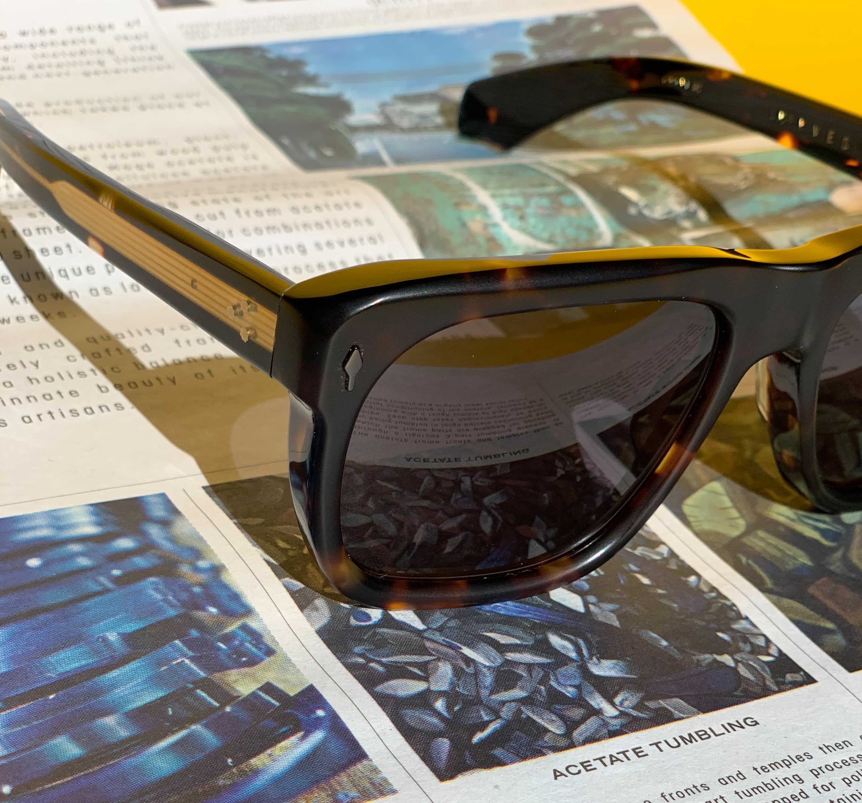 MATERIAL: 10MM BLOCK, MATTE DARK HAVANA ACETATE FRAME FRONT, CUSTOM DOUBLE LAMINATED ACETATE TEMPLES FT. PRECIOUS METAL HARDWARE